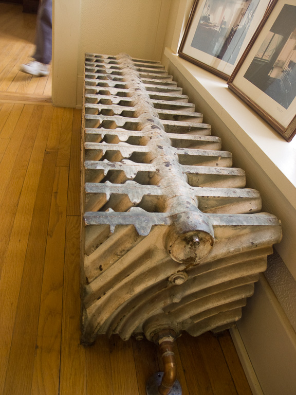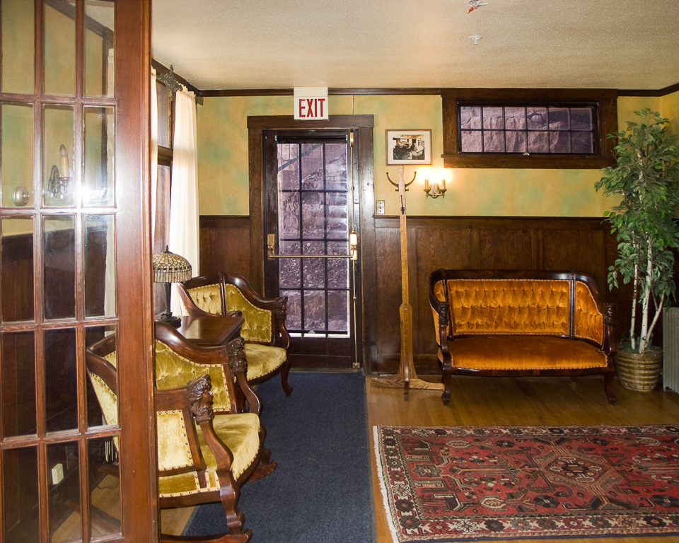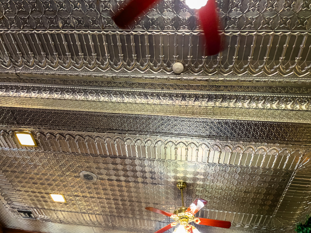 R: The stamped metal ceiling of the Trading Post.