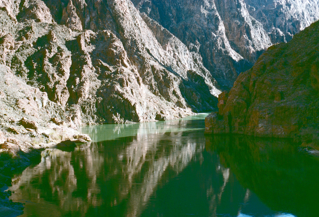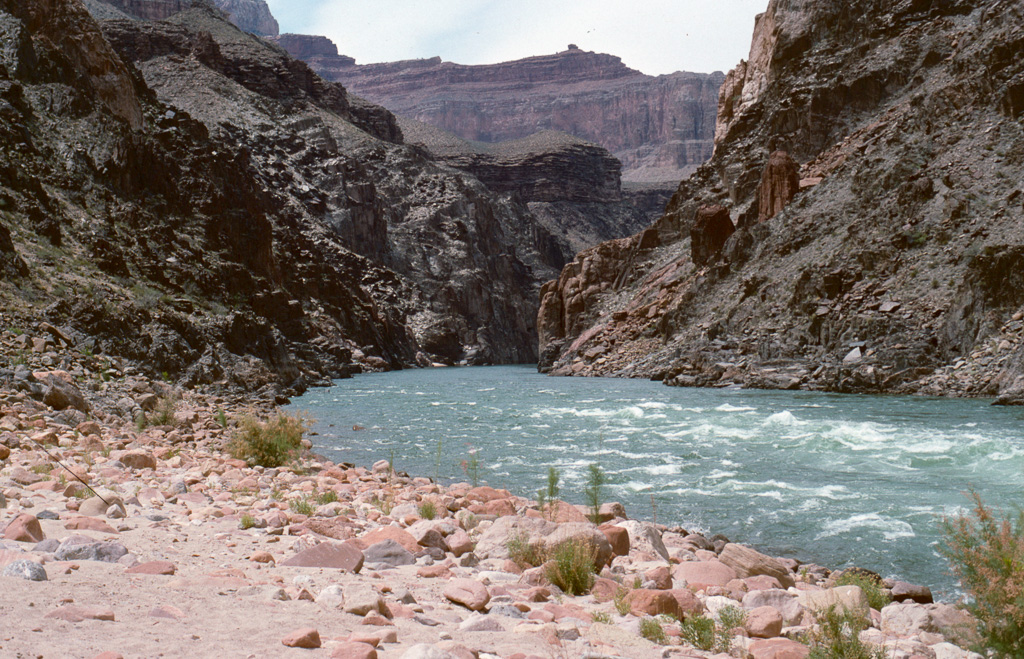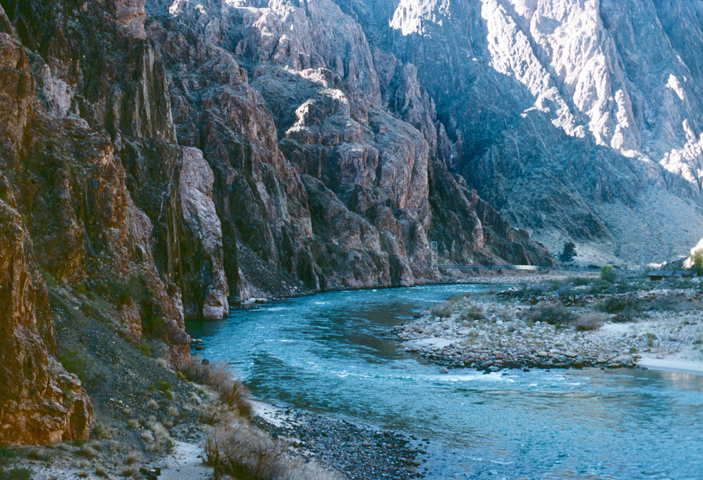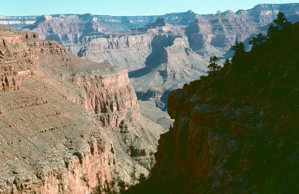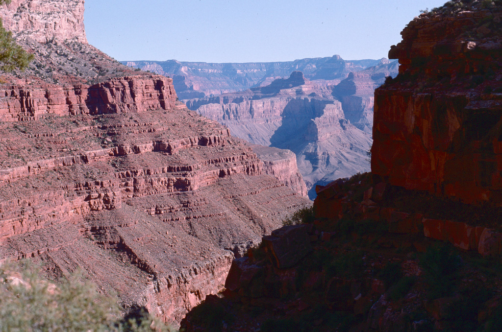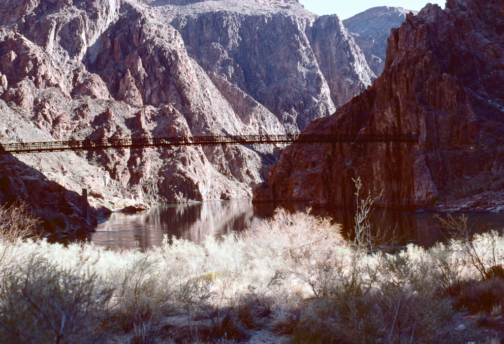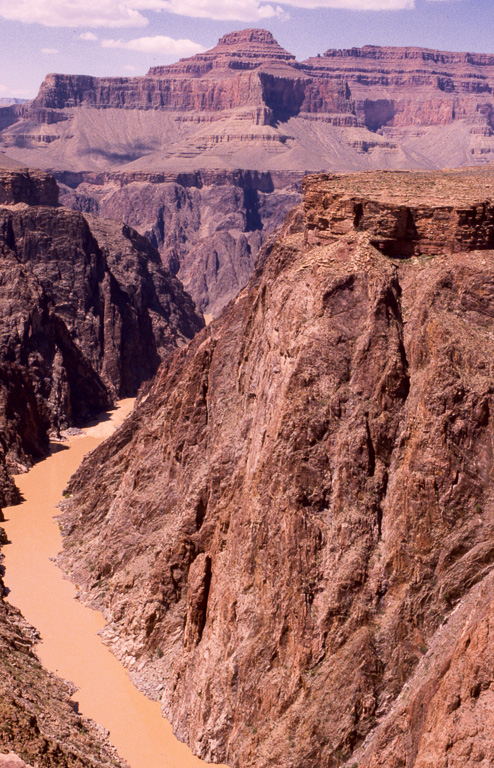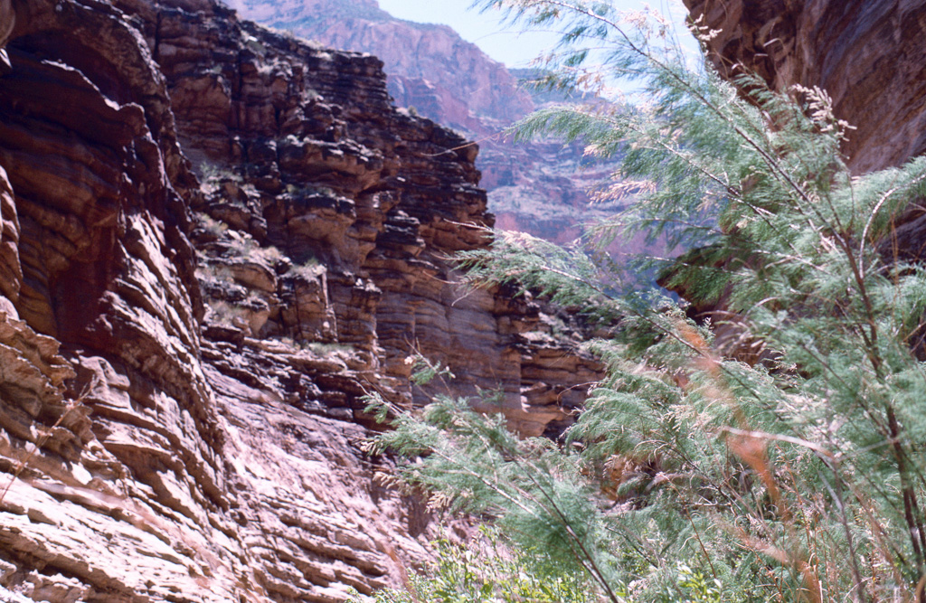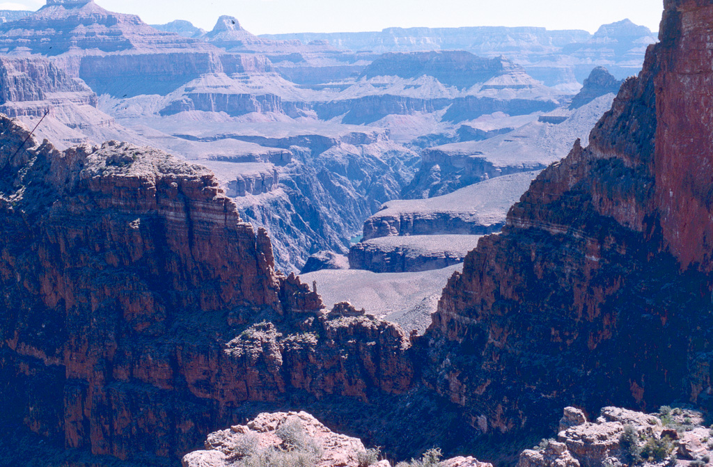 The Colorado River was already an “old” river by seven million years ago, meandering across a level sandstone plain in bands and oxbows, like a limiature Mississippi. Then the plain began rising, slowly enough that the river could keep its course as it etched down into the plain to keep up. Now that the plain has become the Kaibab Plateau, the canyon has reached over a mile in depth, cutting down through all of the sandstone layers and into the continental basement rock below it.