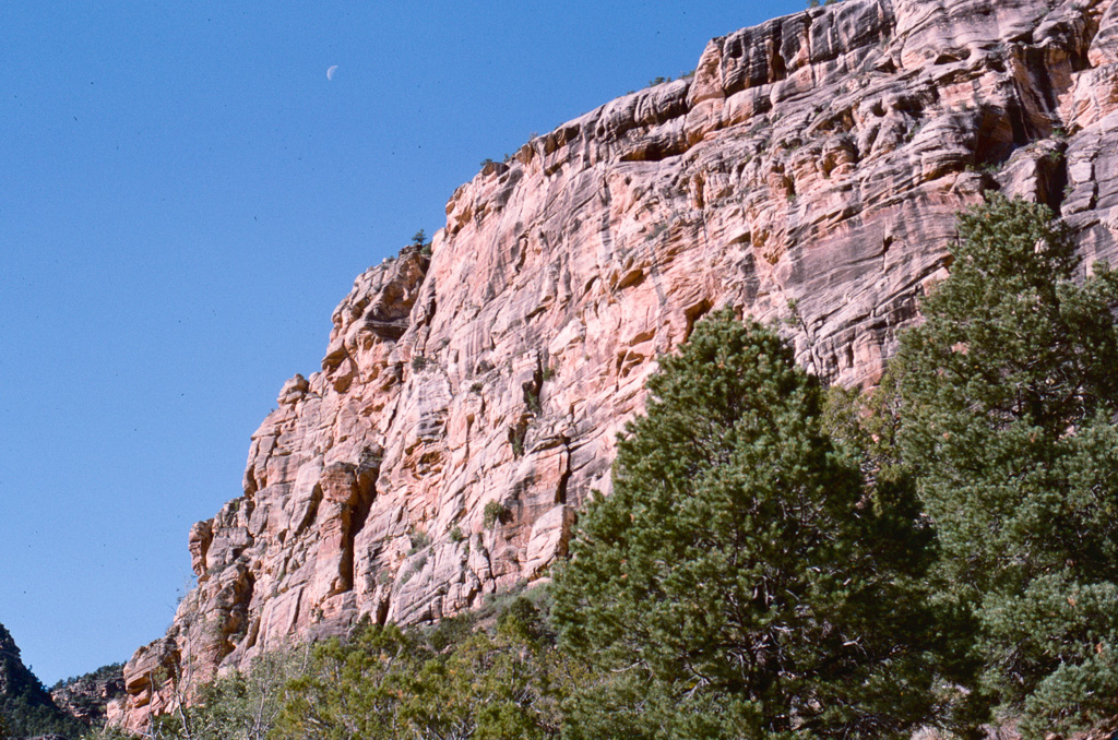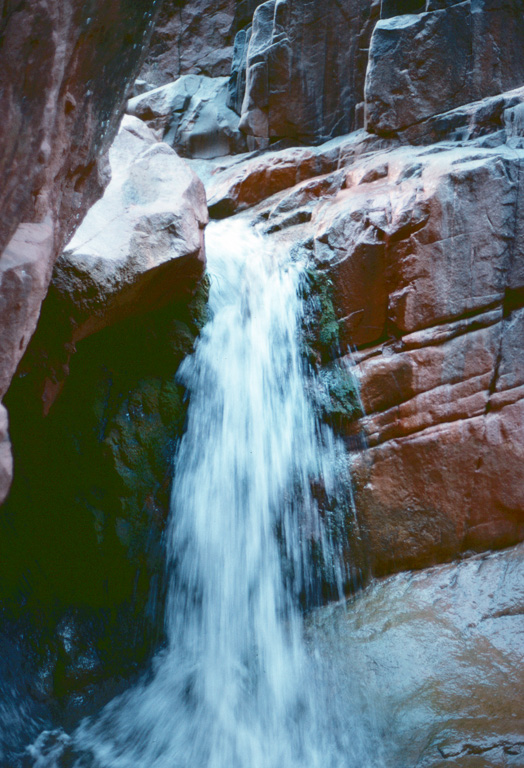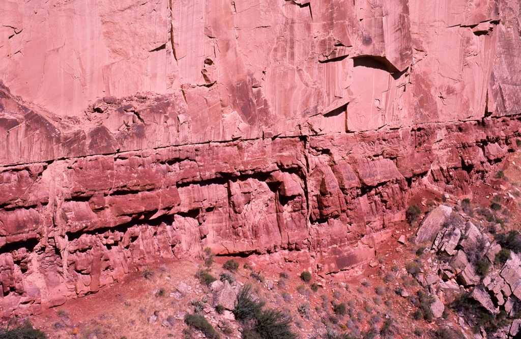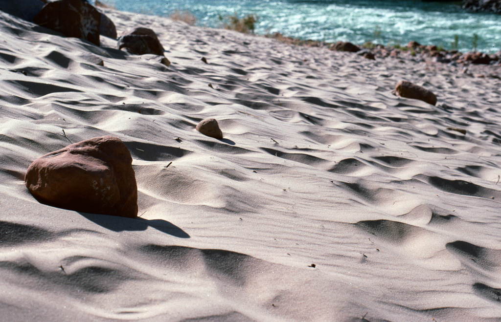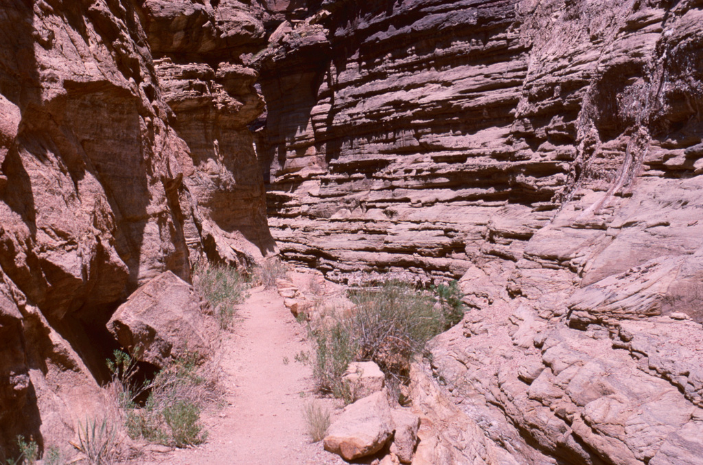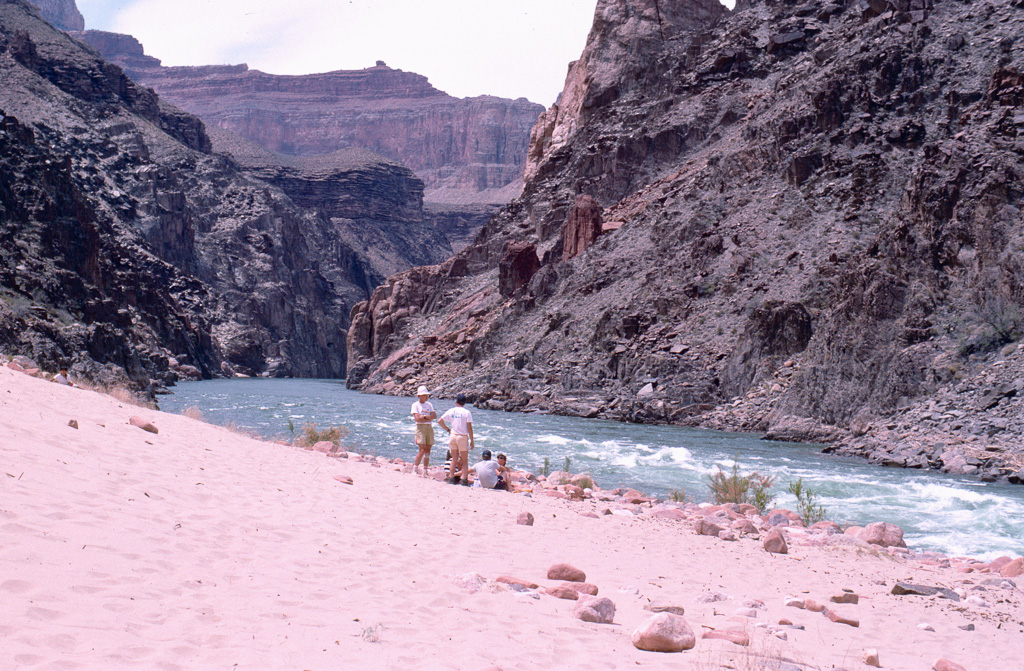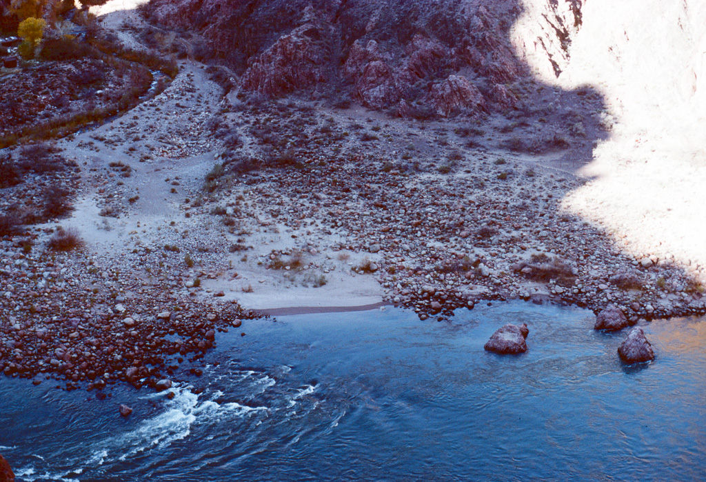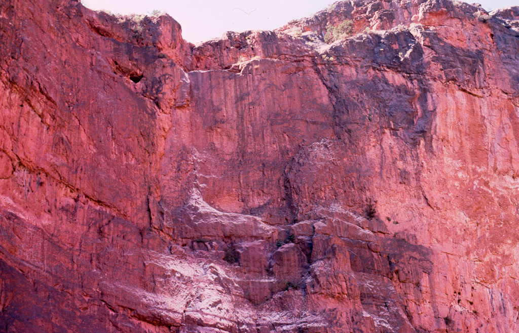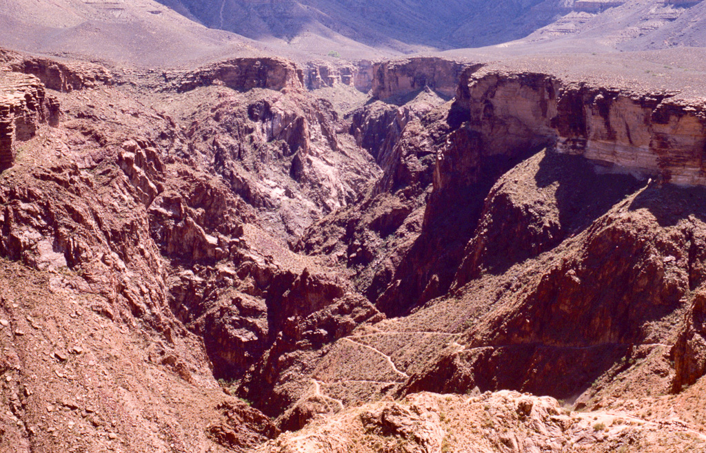 The Colorado River was already an “old” river by seven million years ago, meandering across a level sandstone plain in bands and oxbows, like a limiature Mississippi. Then the plain began rising, slowly enough that the river could keep its course as it etched down into the plain to keep up. Now that the plain has become the Kaibab Plateau, the canyon has reached over a mile in depth, cutting down through all of the sandstone layers and into the continental basement rock below it.
